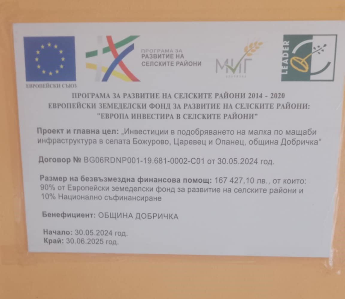 ПРОЕКТ № BG06RDNP001-19.681-0002-C02 „Инвестиции в подобряването на малка по мащаби инфраструктура в селата Божурово, Царевец и Опанец, община Добричка“