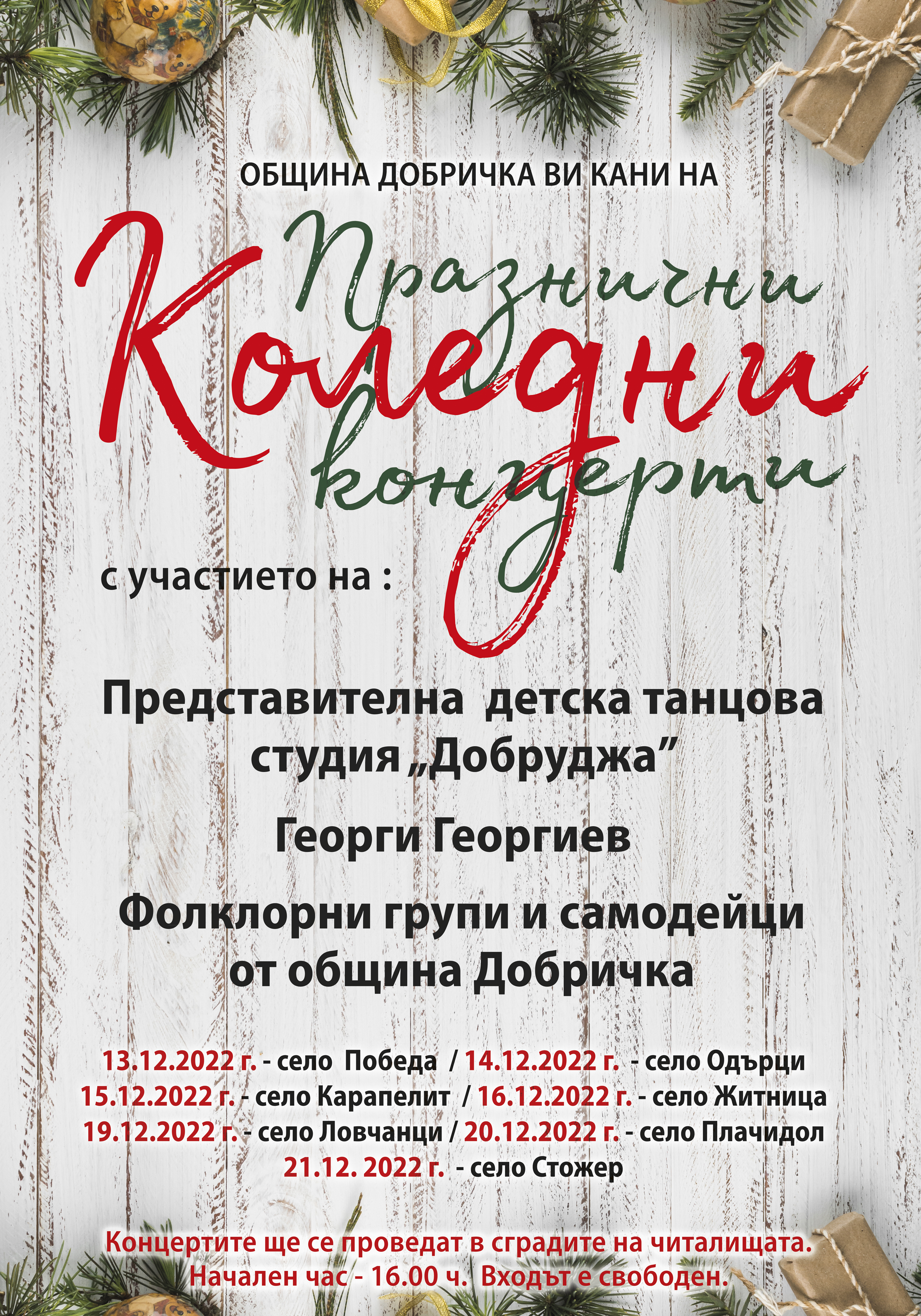 12.12.2022Коледни концерти ще съберат през декември в читалищата живеещите на територията на община Добричка. Началният час на празничните събития, организирани от Община Добричка, е 16.00.