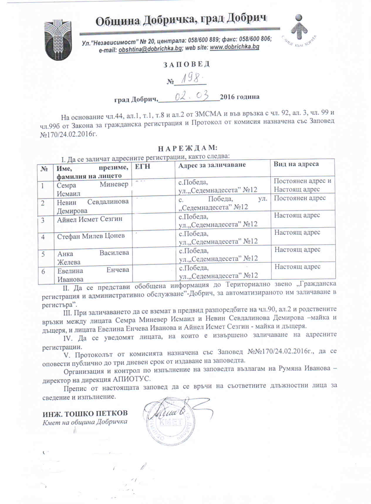 Новини Вие сте тук: Начало Новини Заповед №198/02.03.2016 г. на кмета на община Добричка Заповед №198/02.03.2016 г. на кмета на община Добричка 02.03.2016 Прикачени файлове Заповед №198/02.03.2016 г. на кмета на община Добричка Качен 30.11.-1 143.11 KB