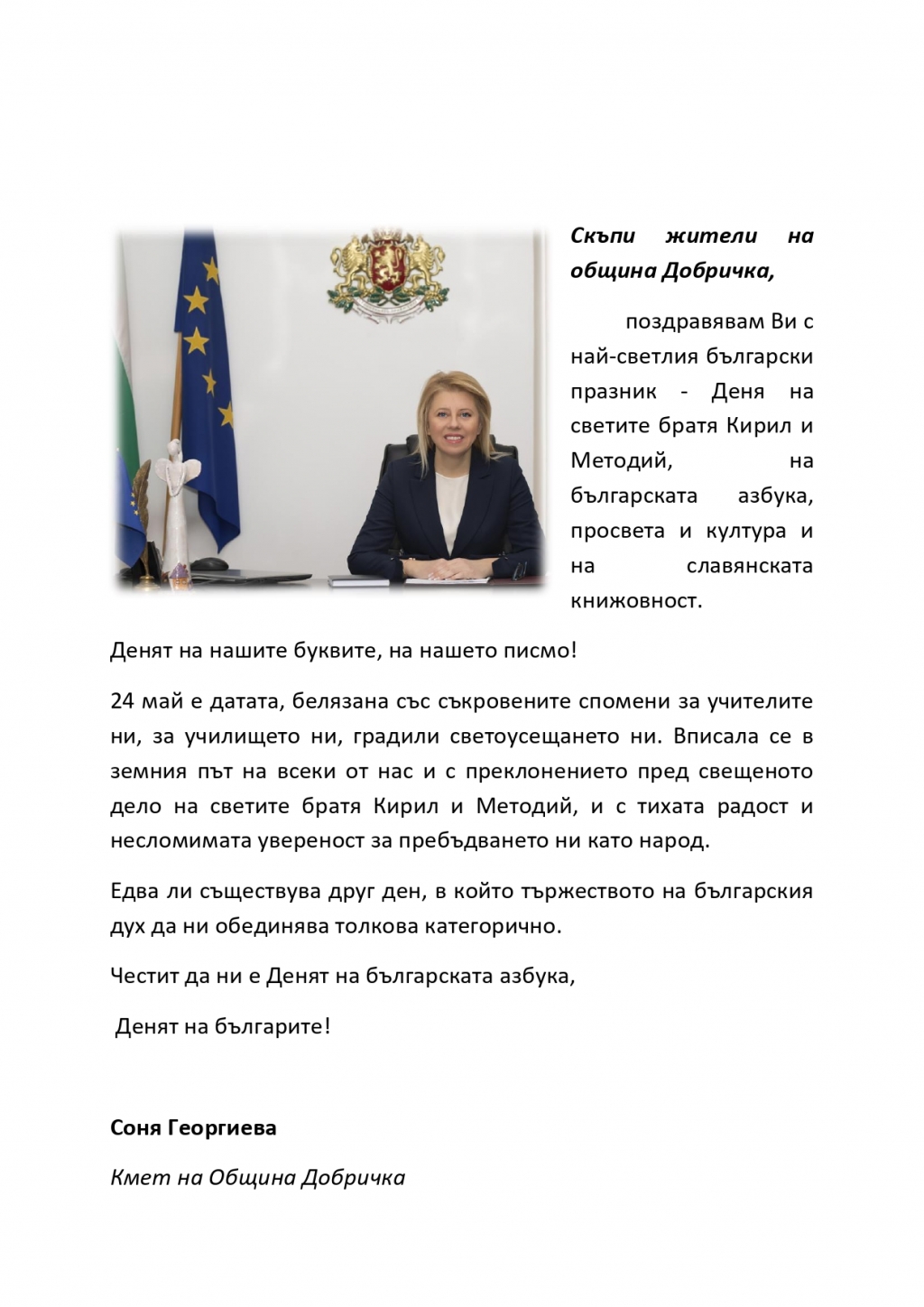 Кметът Соня Георгиева: Честит да ни е Денят на българската азбука, Денят на българите!