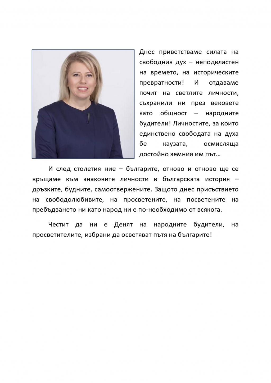 Кметът Соня Георгиева: Честит да ни е Денят на народните будители - просветителите,...