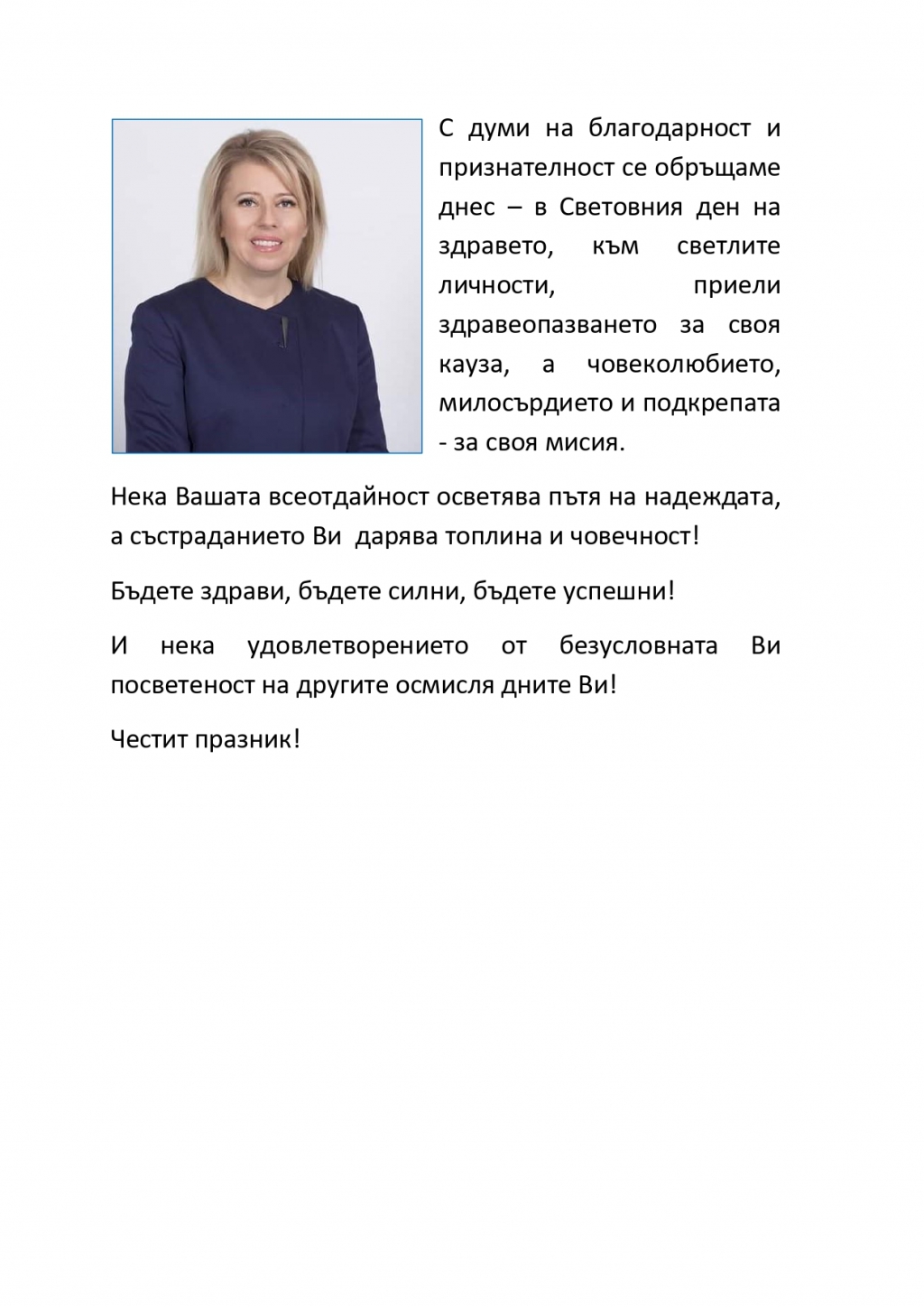 Кметът Соня Георгиева: Нека Вашата всеотдайност осветява пътя на надеждата!